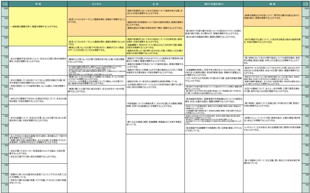 CASECのスコアはTOEICではXX点相当、英検ではXX級相当と示すスタイルとなっているため、ビジネス英語に特化した実力診断ではないことに留意が必要です。